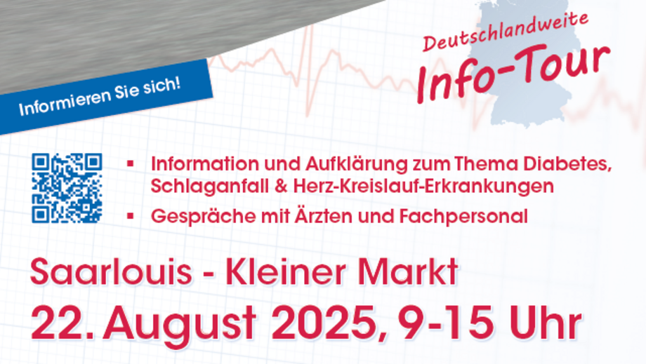 Mit einem vielseitigen Angebot zu den Themen Diabetes, Schlaganfall und Herzgesundheit werden wir am Freitag, dem 22. August, von 9 - 15 Uhr auf dem Kleinen Markt präsent sein. In Zusammenarbeit mit der Stadt Saarlouis und dem Zweckverband für Rettungsdienst und Feueralarmierung Saar bietet unser Team kostenfrei Messungen, Beratungen und interessante Informationsmöglichkeiten an.