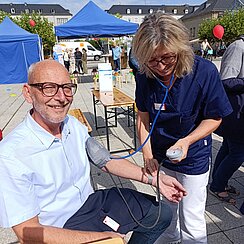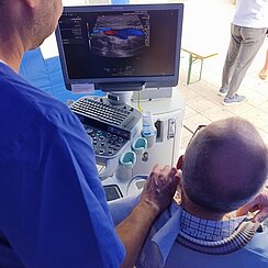 Neben der Möglichkeit, sich Blutzucker und Blutdruck bestimmen zu lassen, nutzten die meisten Besucherinnen und Besucher die Gelegenheit der Ultraschalluntersuchung ihrer Halsschlagader. Da nahmen sie die kleine Wartezeit bei strahlendem Sonnenschein gerne in Kauf. Im eigens dafür eingerichteten Pavillon wurden die Besucherinnen und Besucher durch Fachärzte der Angiologie und der Neurologie bei einem Ultraschall der hirnversorgenden Gefäße zum individuellen Risiko anhand der erhobenen Befunde beraten. Rauchen, Bluthochdruck und Diabetes standen als wichtigste Risikofaktoren hier insbesondere im Fokus.